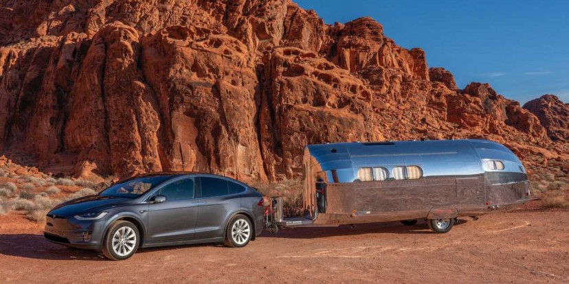 Tesla Model X towing Bowlus RV